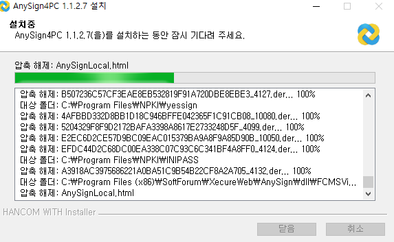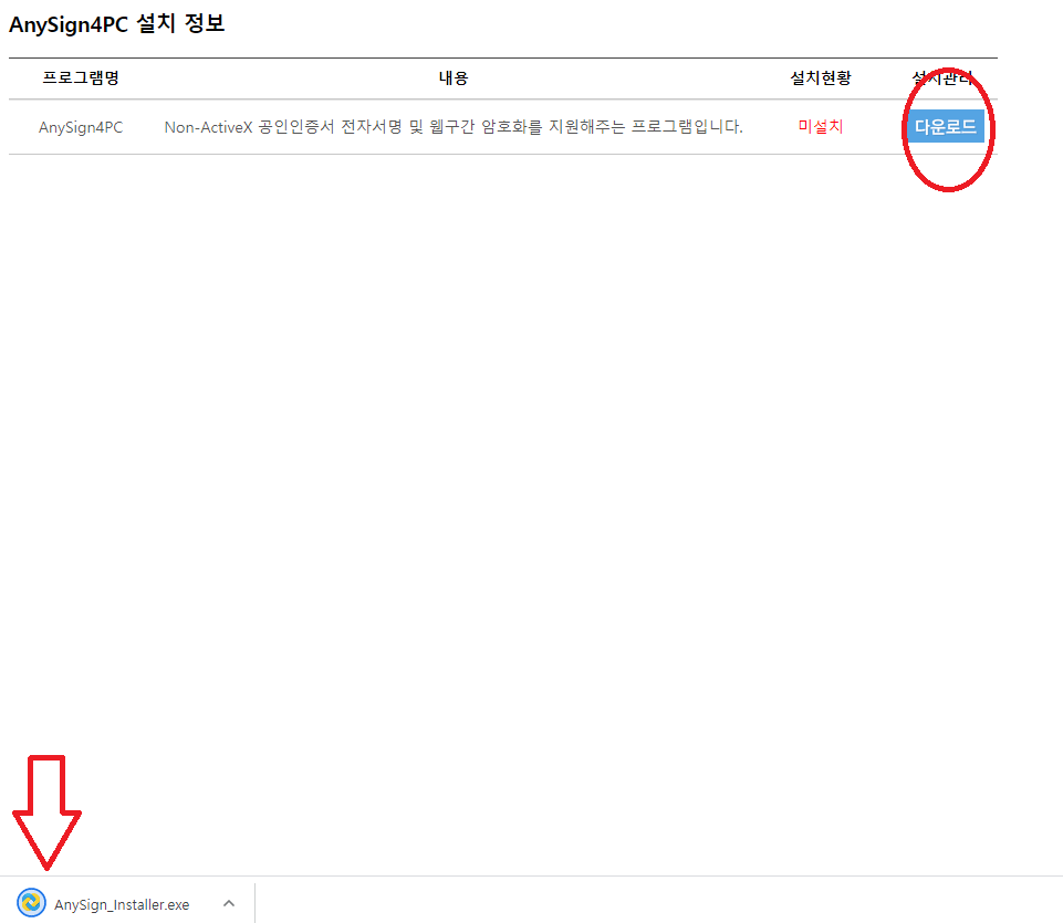 "다운로드" 클릭 - 하단 "AnySign_Installer.exe" 클릭