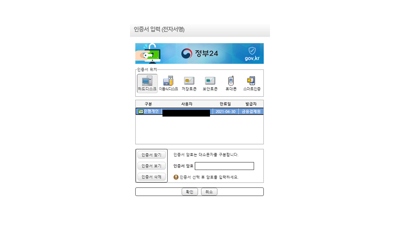 컴퓨터에 저장된 공인인증서의 암호를 입력하거나