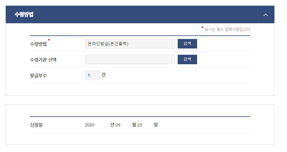 "온라인 발급(본인출력)"을 선택하시고 진행하세요