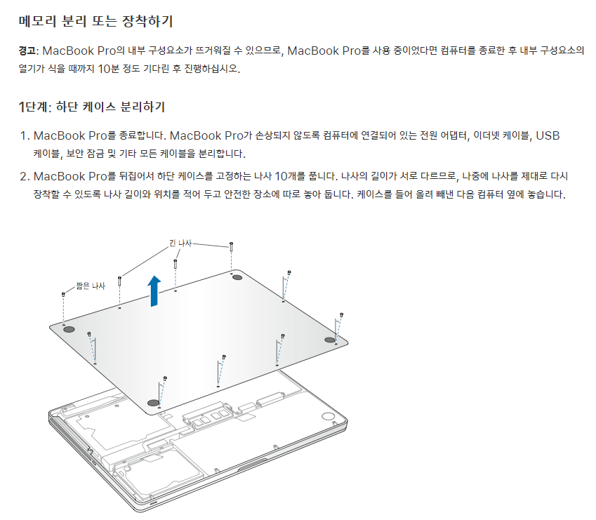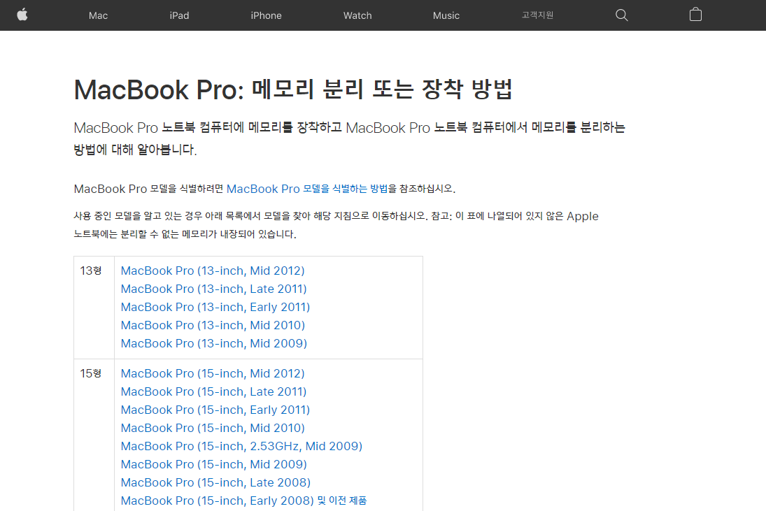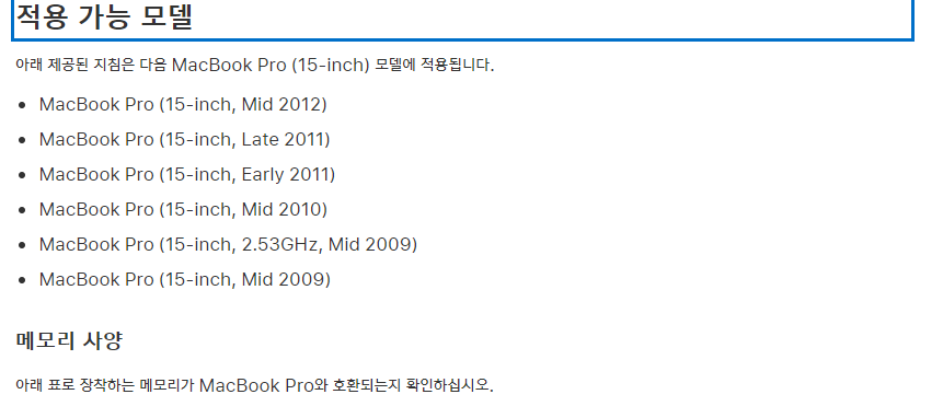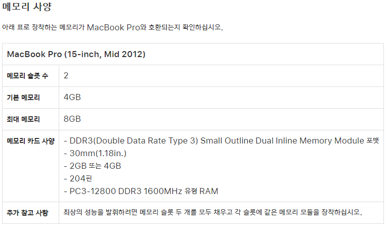 근데 아무 메모리를 추가할 수 없기에 알아보다가 찾은 애플지원센터 홈페이지