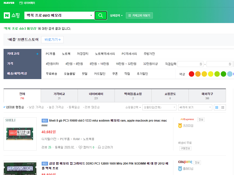 네이버에 검색해보니 다양한 사이트에서 메모리를 팔고있습니다.