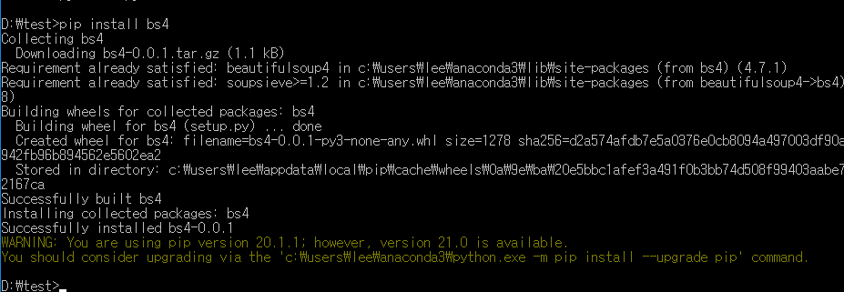 pip install bs4를 이용하여 beautifulsoup 다운로드