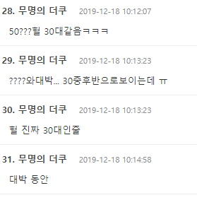 "50??헐 30대 같음 ㅋㅋㅋ " , "???와 대박... 30 중후반으로 보이는데" , "헐 진짜 30대 인줄" , "대박 동안"