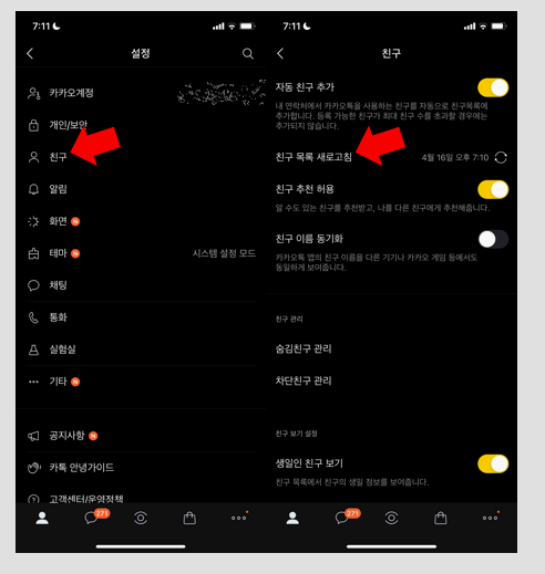 친구를 클릭하신 후 친구목록 새로고침을 눌러줍니다.