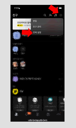 연락처 추가후 우측 상단 톱니바퀴를 클릭하신 후 전체설정 클릭