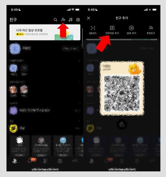 카카오톡에 접속한 뒤 상단 클릭을통해 연락처를 추가합니다.