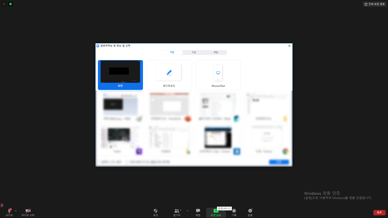 화면 화단에 초록색 화면 공유 버튼이 있습니다.